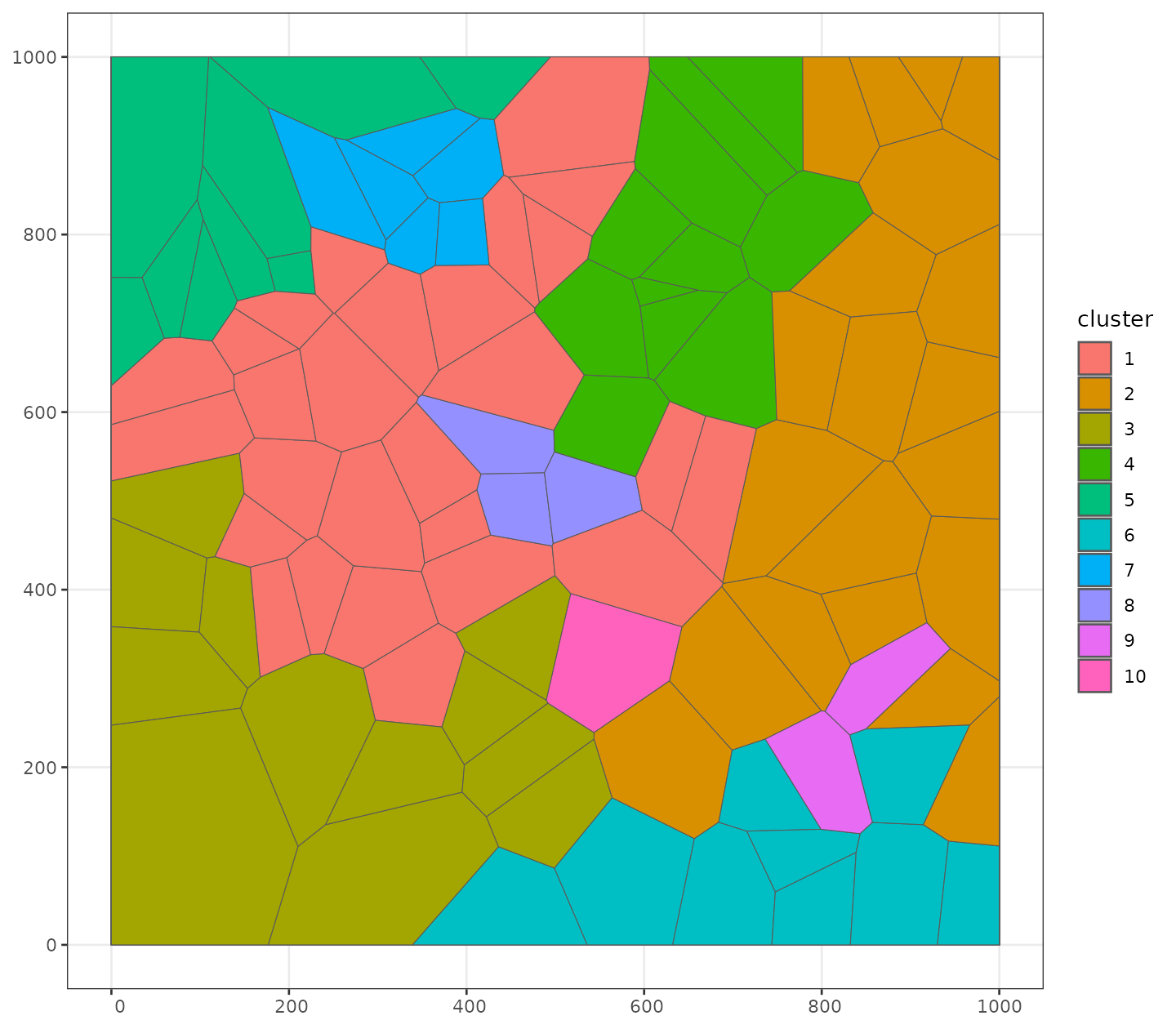 st_sf(st_geometry(stgaus), cluster = factor(initial_cluster$membership)) |>